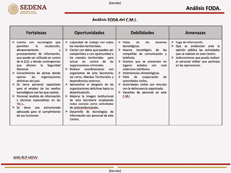 El documento de abril de 2021, mencionado arriba, muestra que la Sedena es consciente de esta ilegalidad. Se trataba de un análisis de las “fortalezas, oportunidades, debilidades, amenazas” del CMI; en este archivo, marcado como “secreto”, la Sedena presumía que el CMI contaba con buenas tecnologías, con personal capacitado y con buen conocimiento de los “medios tecnológicos con los que cuenta”, pero reconocía, en el apartado de “amenazas”, algunos riesgos como la “fuga de información”, las “indiscreciones que pueda realizar el personal militar que participa en las operaciones”, o el hecho que la opinión pública descubra las “actividades” del CMI.