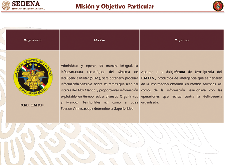 Un documento interno de la Sedena plantea que la misión del CMI consiste en “administrar y operar, de manera integral, la infraestructura tecnológica del Sistema de Inteligencia Militar (S.I.M.), para obtener y procesar información sensible, sobre los temas que sean del interés del Alto Mando y proporcionar información explotable, en tiempo real, a diversos Organismos y Mandos Territoriales, así como a otras Fuerzas Armadas que determine la Superioridad”.